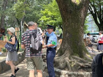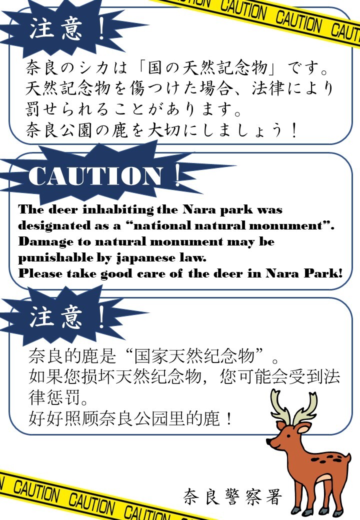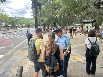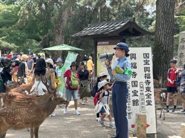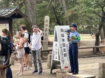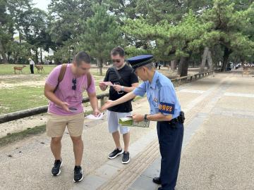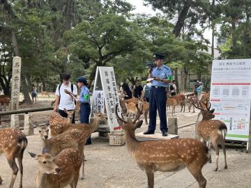 同公園は国内外から多くの観光客が訪れることから、英語、中国語等複数の言語を話せる警察官が”マルチリンガルDJポリス”として街頭に立ち、道行く観光客等に啓発チラシを配布するとともに、「「奈良のシカ」は国の天然記念物に指定され、文化財として保護されています。シカに危害を加える行為は絶対にやめましょう。」等と呼び掛けました。
